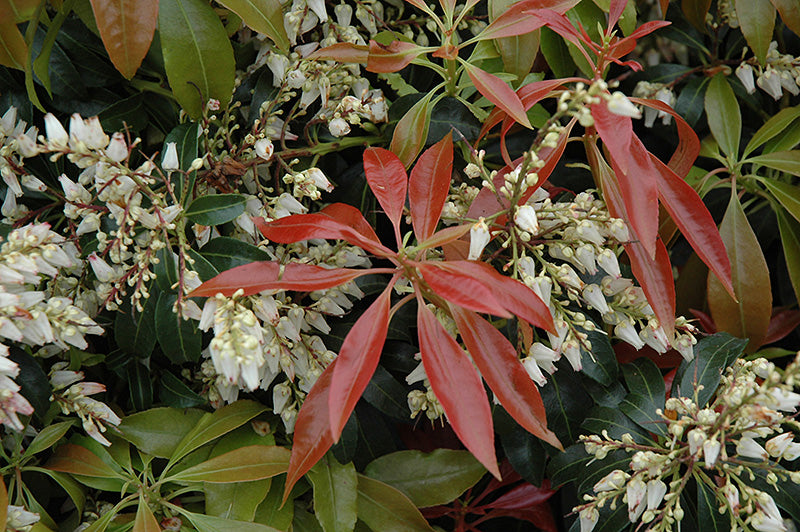 A genuinely exquisite broadleaf evergreen shrub much cherished for its delicate and showy chains of small white bell-shaped flowers and bright red emerging foliage, one of the hardiest cultivars; performs best in moist, organic and acidic soils.