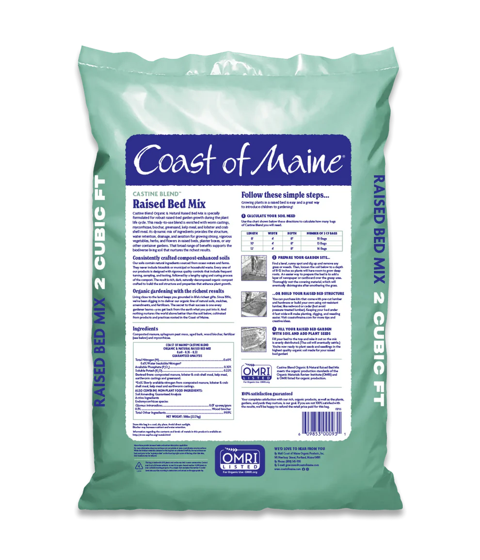 Castine Blend Organic & Natural Raised Bed Mix is specially formulated for robust raised-bed garden growth during the plant life cycle. This ready-to-use blend is enriched with worm castings, mycorrhizae, biochar, greensand, kelp meal, and lobster and crab shell meal. Its dynamic mix of ingredients provides the structure, water retention, drainage, and aeration for growing strong, vigorous vegetables, herbs, and flowers in raised beds, planter boxes, or any other container gardens. That broad range of benefits supports the biodiverse living soil that nurtures the richest results.