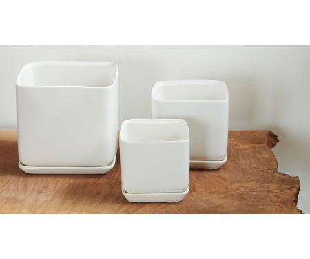 Pacific Home & Garden Palm Springs Cube Pots are elegant ceramic planters. They are made of quality terracotta and feature a matte finish. The attached saucers collect excess water to help prevent overwatering and protect surfaces.
