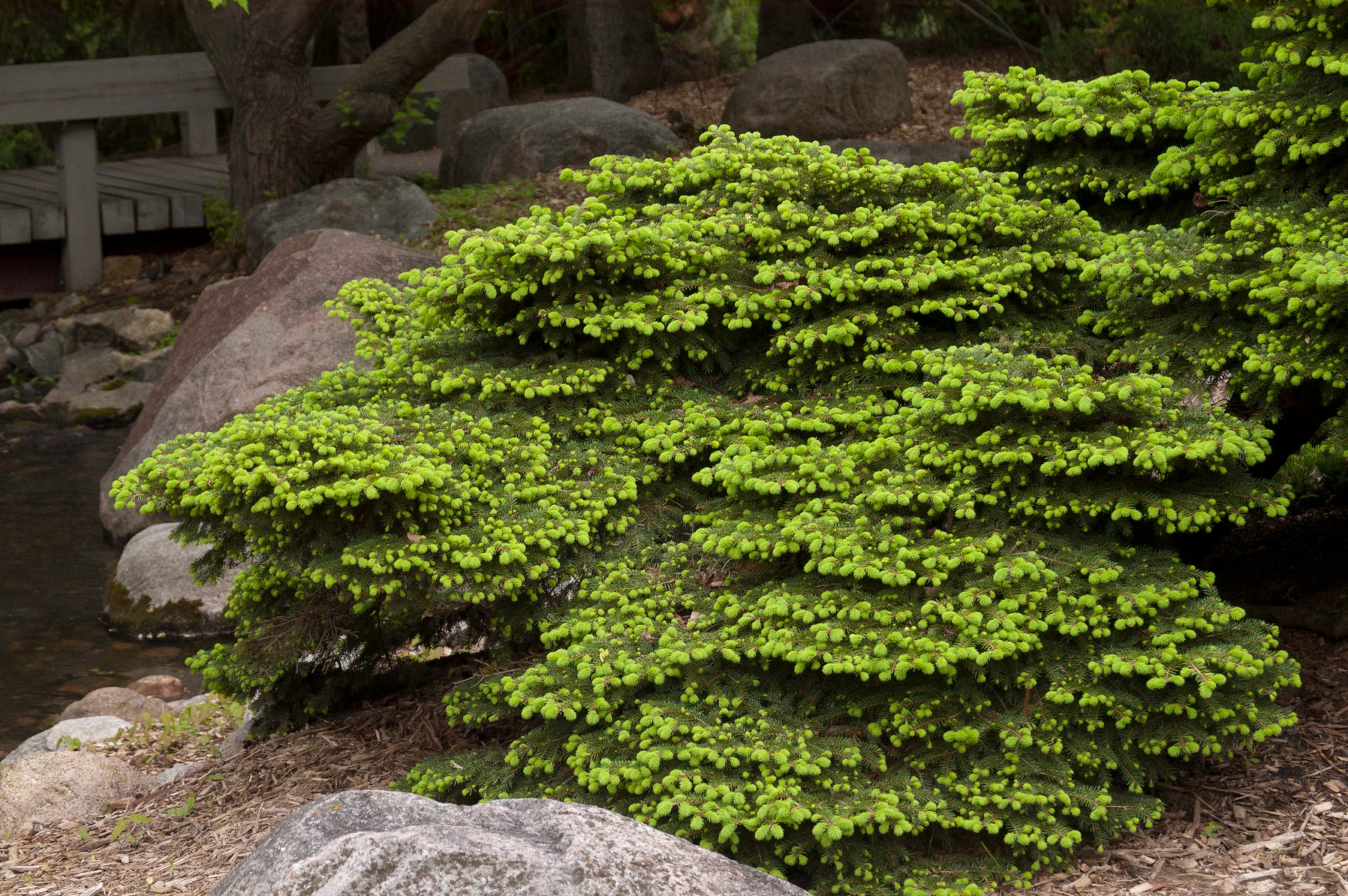 Use evergreens to add structure, texture and year-round color to your landscape. Bird's Nest Spruce truly shines in wintertime.